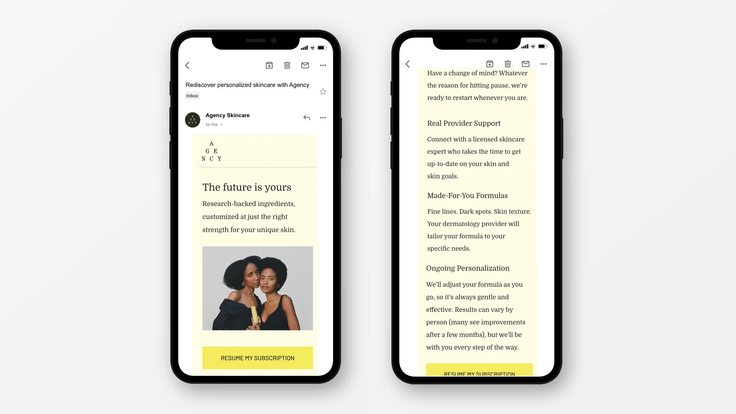 Agency is a personalized anti-aging skincare brand. Founded by the creators of Curology and launched in February, Agency’s mission is to create custom formulas to help target your specific skin concerns. I was part of the team of copywriters supporting the brand’s launch, from paid ads to lifecycle emails to social content.